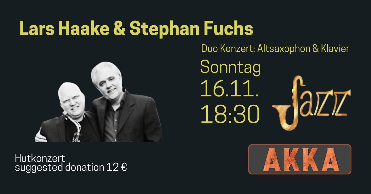 Der gebürtige Paderborner Saxofonist, Lars Haake (NYC), und Pianist, Stephan Fuchs (Leipzig), die sich im Studium kennenlernten, spielen seit fast dreißig Jahren zusammen Duo Jazz. Ein Repertoire von Keith Jarrett und Pat Metheny zu Wayne Shorter und Ivan Lins nimmt das Publikum mit auf eine Reise jenseits von Swing und Bop. Aufgetreten sind die beiden zusammen schon u.a. in Brasilien, den USA und Frankreich und jedes Jahr in München in der Jazzbar Vogler.