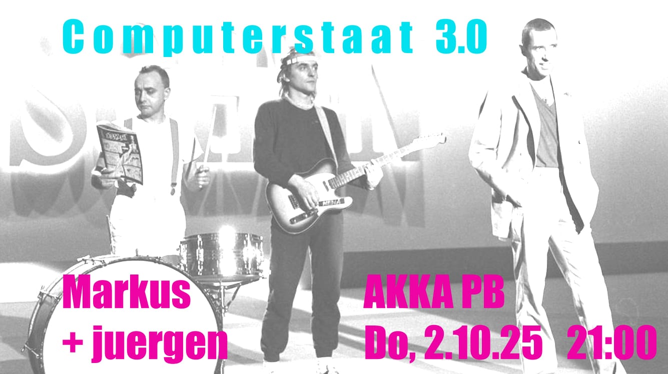 Die drei stadtbeliebten Musiker, Pete, Andi und Dieter wollen es nochmal krachen lassen und es nicht versäumen, noch in diesem Jahr 2023 ihr Stelldichein in der AKKA zu geben. Pete und Andi spielen Gitarre, Bass und singen, während Dieter dazu am Schlagzeug mit Takt und Rhythmus das Ganze abrundet. Eine Mischung aus Songs der 60er, 70er und 80er Jahre bilden die Grundlage der Interpretation im eigenen ostwestfälisch einmaligen Stil. Die Spielfreude der Vollblutmusiker bietet unseren Gästen ein musikalisch entspanntes und gleichzeitig hochgradig unterhaltsames Konzerterlebnis, um dem Jahreswechsel in typischer AKKA- Atmosphäre entgegenzusteuern.